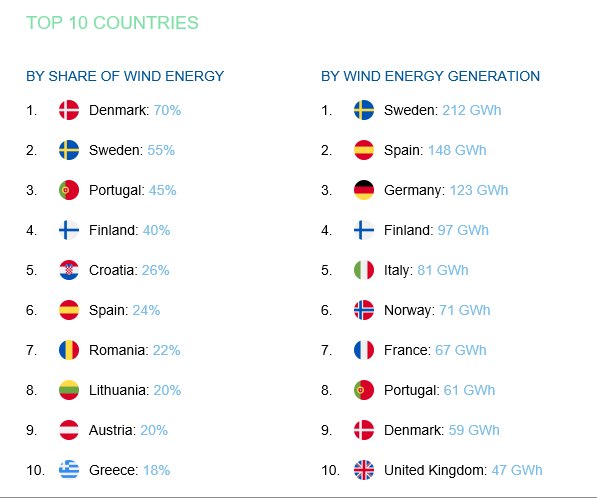 Στις τρείς πρώτες θέσεις βρέθηκαν η Δανία (70%), η Σουηδία (55%) και η Πορτογαλία (45%). Στην παραγωγή ηλεκτρικής ενέργειας, η χώρα μας βρέθηκε στην 15η θέση παράγωντας 24,7 GWh.