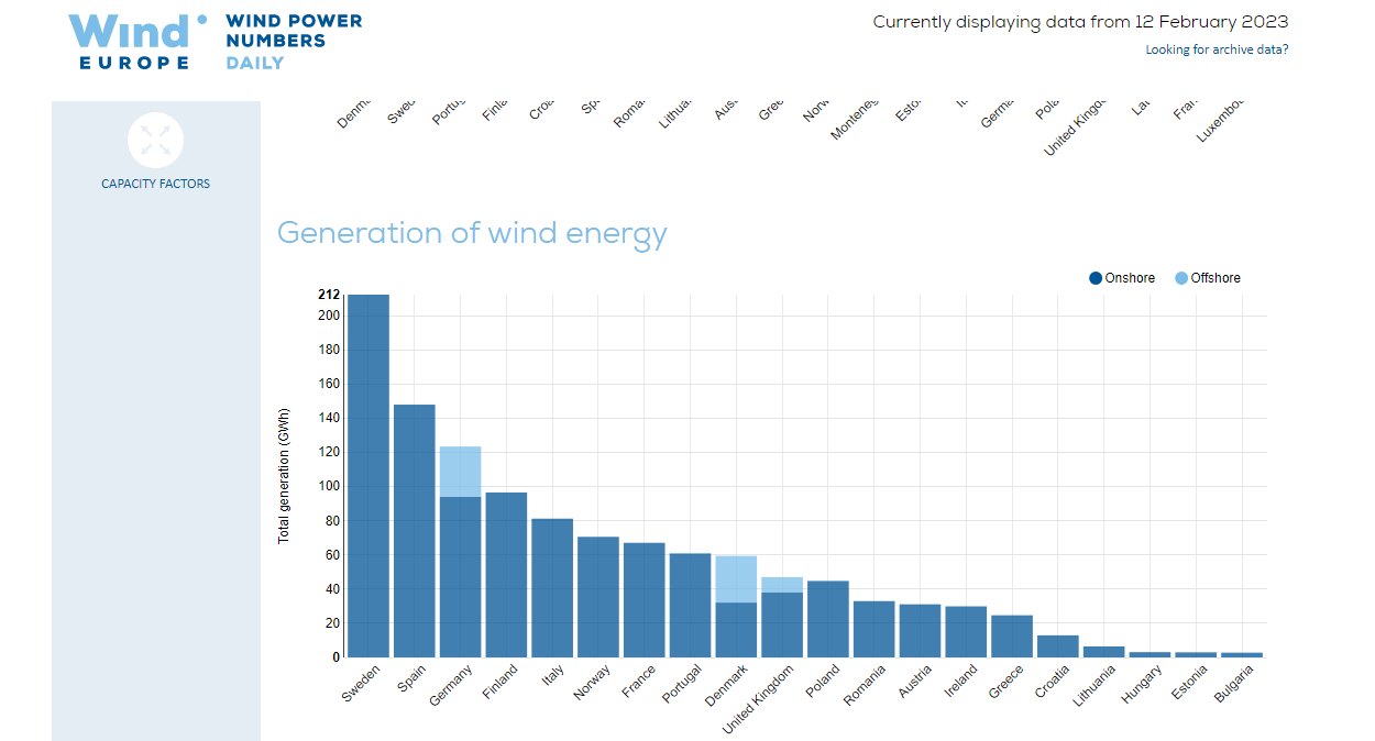 Η χώρα μας, στις 12 Φεβρουαρίου, βρέθηκε πίσω από Αυστρία, Λιθουανία, Ρουμανία και Ισπανία. Συνολικά, στην Ευρώπη, τα αιολικά πρόσφεραν το 14.3%