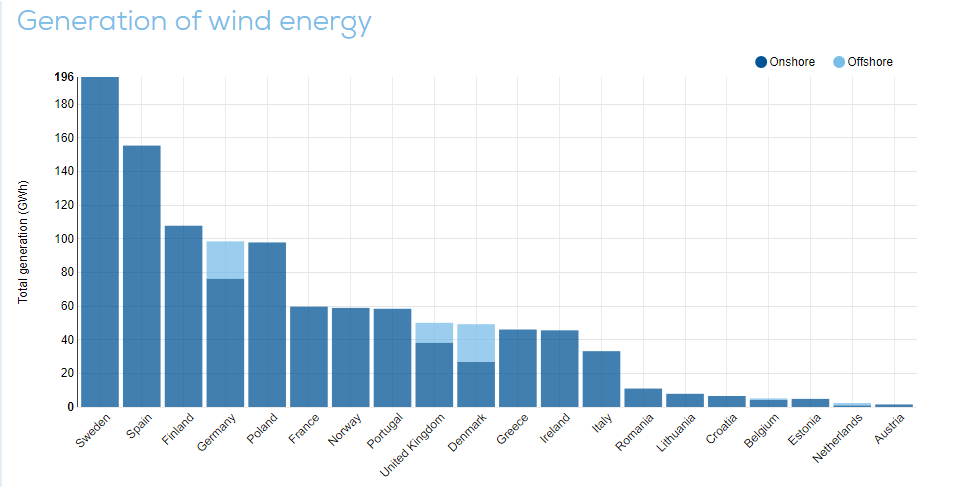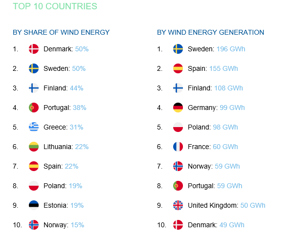 Στις τρείς πρώτες θέσεις της παραγωγής ενέργειας από αιολικά βρέθηκαν η Σουηδία (196 GWh), η Ισπανία (155% GWh) και η Φινλανδία (108 GWh %).