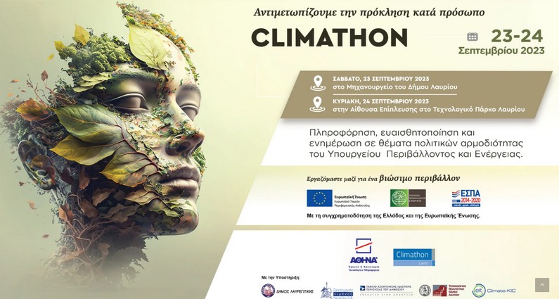 Το Υπουργείο Περιβάλλοντος και Ενέργειας διοργανώνει το «Climathon», ένα διήμερο Συνέδριο ιδεών, με βασικό στόχο να ευαισθητοποιήσει τους πολίτες σε θέματα που αφορούν στην κλιματική αλλαγή. Το Συνέδριο θα πραγματοποιηθεί το Σάββατο, 23 Σεπτεμβρίου 2023, στο Μηχανουργείο του Δήμου Λαυρίου και την Κυριακή, 24 Σεπτεμβρίου 2023, στην Αίθουσα Επίπλευσης στο Τεχνολογικό Πάρκο Λαυρίου.