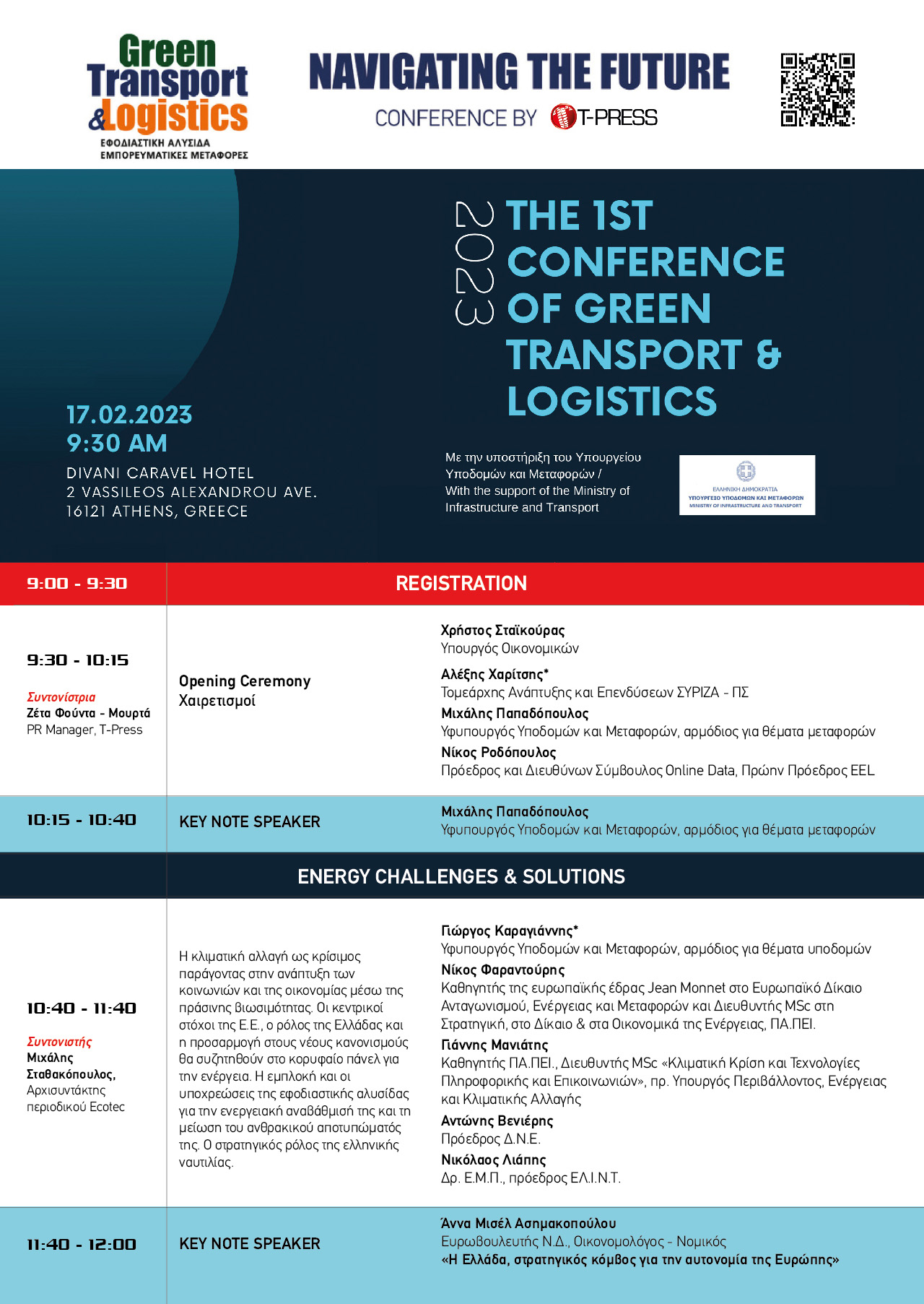 Την Παρασκευή 17 Φεβρουαρίου θα πραγματοποιηθεί το 1ο Αναπτυξιακό Συνέδριο Green Transport & Logistics, με τίτλο «Navigating the Future», το οποίο διοργανώνει η «Τεχνοεκδοτική / T-Press», στο ξενοδοχείο Divani Caravel. Πρώτη θεματική ενότητα, “Energy Challenges & Solutions”