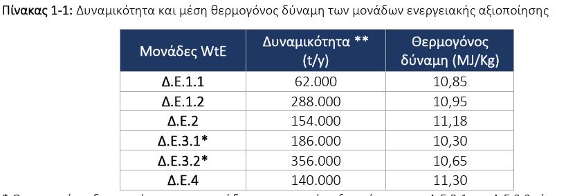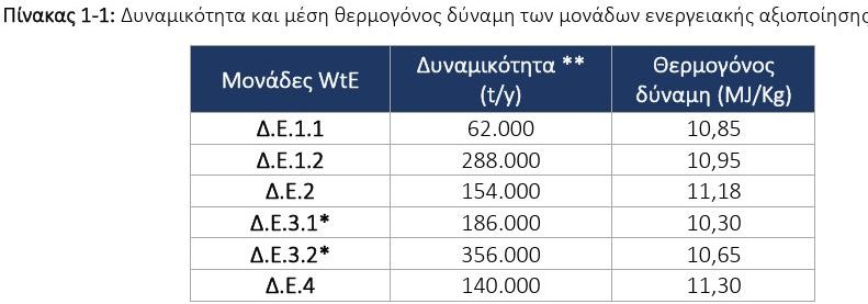 * Οι παραπάνω δυναμικότητες των μονάδων ενεργειακής αξιοποίησης των Δ.Ε.3.1 και Δ.Ε.3.2 είναι οι διάμεσες τιμές και δεν μπορούν να είναι δεσμευτικές, λόγω της περιορισμένης ωριμότητας στις διαδικασίες υλοποίησης των ΜΕΑ/ΜΑΑ στην Περιφέρεια Αττικής. Για το λόγο αυτό, προτείνεται υπέρ ασφαλείας, η προσθήκη εύρους τιμών και συγκεκριμένα για τη μονάδα της Δ.Ε.3.1 από 141.000 – 221.000 t/y και για τη μονάδα της Δ.Ε.3.2 από 321.000 – 401.000 t/y. ** Οι παραπάνω δυναμικότητες δύναται να διαφοροποιηθούν μη ουσιωδώς έως την έναρξη λειτουργίας των μονάδων ενεργειακής αξιοποίησης, εάν προκύψει τεκμηριωμένα τέτοια ανάγκη, λόγω επικαιροποίησης των δεδομένων παραγωγής ΑΕΠΥ.