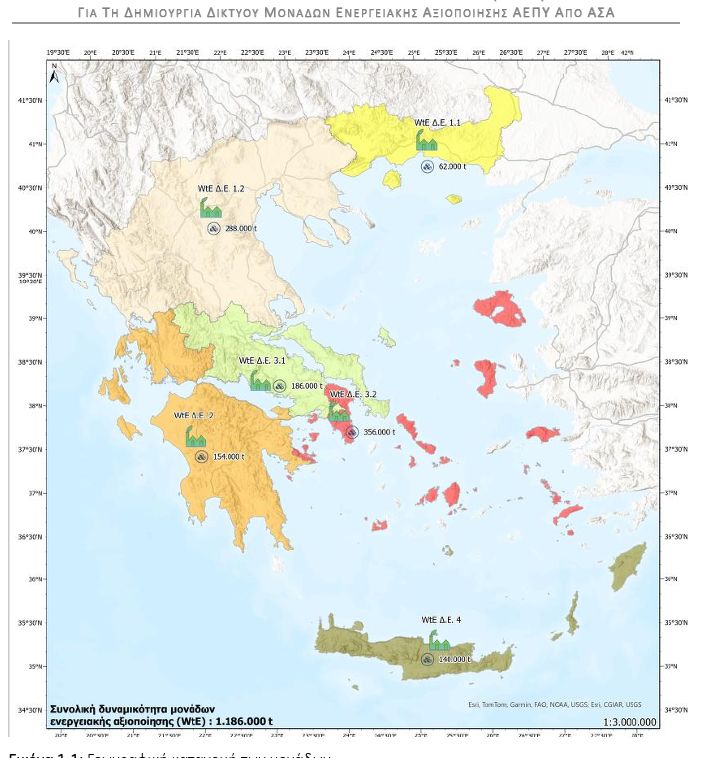 Όπως αναφέρετε στην ΣΜΠΕ, ενσωματώνεται η περιβαλλοντική διάσταση κατά την υιοθέτηση ενός δικτύου έξι μονάδων ενεργειακής αξιοποίησης σε επίπεδο χώρας, μέσω της αξιολόγησης και εκτίμησης των επιπτώσεων που ενδέχεται να έχουν στο περιβάλλον. Όπως αναφέρει η μελέτη, οι μονάδες αποτυπώθηκαν κεντροβαρικά (ως προς τις ποσότητες που θα οδηγούνται προς ενεργειακή αξιοποίηση σε επίπεδο Π.Ε.) με τη χρήση του εργαλείου Network Analyst μέσω του προγράμματος ArcGIS Pro σε επίπεδο Περιφερειακής Ενότητας* ως ακολούθως: • Δ.Ε.1.1: Π.Ε. Ροδόπης ή Ξάνθης • Δ.Ε.1.2: Π.Ε. Κοζάνης • Δ.Ε.2: Π.Ε. Αρκαδίας, Αχαΐας ή Ηλείας • Δ.Ε.3.1: Π.Ε. Βοιωτίας • Δ.Ε.3.2: Περιφέρεια Αττικής • Δ.Ε.4: Π.Ε. Ηρακλείου.
