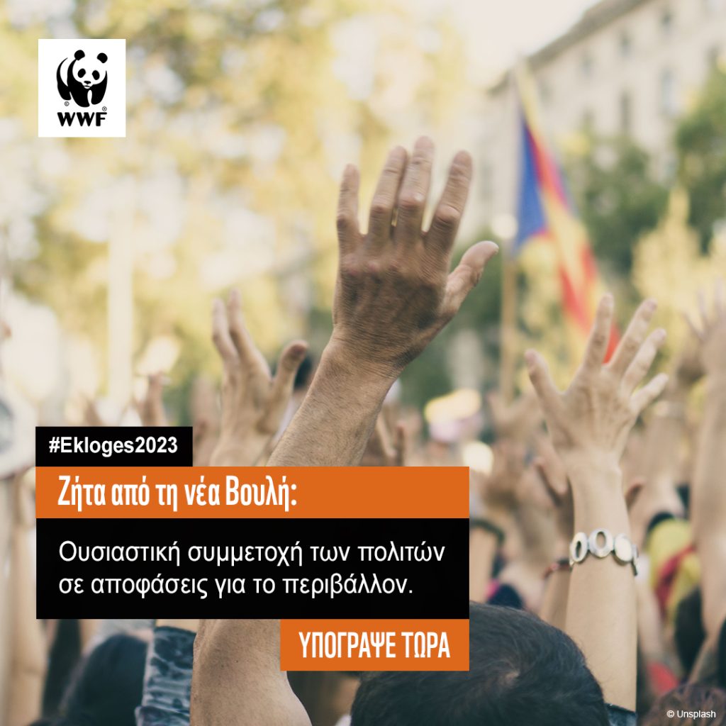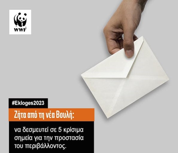 Στο ακόλουθο link μπορείτε να υπογράψετε την έκκληση του WWF Ελλάς, ζητώντας το περιβάλλον να ενταχθεί στον προεκλογικό δημόσιο διάλογο και διεκδικώντας τη δέσμευση των μελλοντικών βουλευτών για ένα βιώσιμο μέλλον https://www.wwf.gr/ti_mporeis_na_kaneis/ekstrateies/ekloges2023/