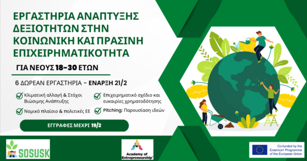 Τα εργαστήρια υλοποιούνται στο πλαίσιο του έργου Erasmus+ ‘SOSUSK– Social and Sustainable skills for young NEET population’ που έχει εγκριθεί από το Ίδρυμα Νεολαίας και Δια Βίου Μάθησης (Ι.ΝΕ.ΔΙ.ΒΙ.Μ).