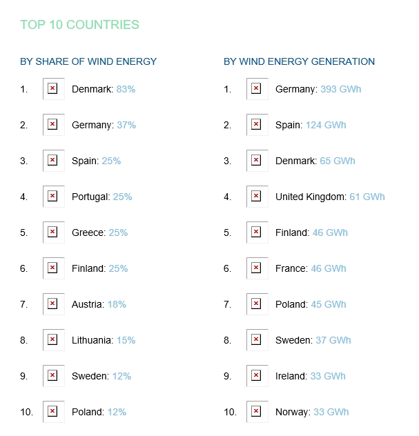 Τη 2η θέση κατέλαβε η Ελλάδα, μεταξύ των ευρωπαϊκών χωρών, στο μερίδιο της αιολικής ενέργειας στο μείγμα της ηλεκτροπαραγωγής της χώρας, σύμφωνα με το δελτίο της WindEurope, που εκπροσωπεί την ευρωπαϊκή αιολική βιομηχανία.