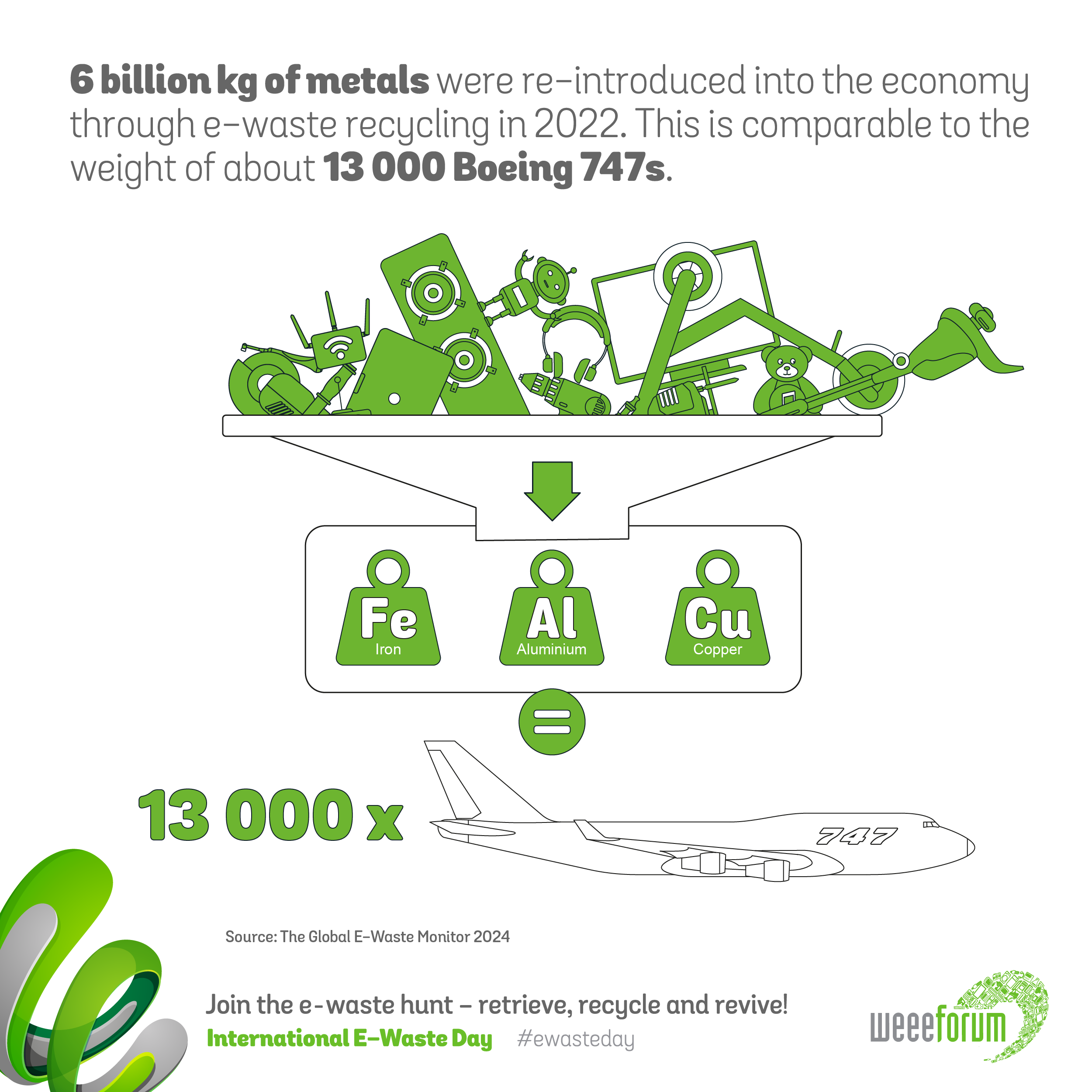 Κάθε χρόνο απορρίπτονται μαζί με τα συνήθη οικιακά απορρίμματα 14 τόνοι ηλεκτρικών και ηλεκτρονικών αποβλήτων τα οποία ισοδυναμούν σε βάρος περίπου 24.000 από τα βαρύτερα επιβατικά αεροπλάνα του κόσμου -αρκετά για να σχηματίσουν μια ουρά από το Λονδίνο έως το Ελσίνκι, τη Νέα Υόρκη έως το Μαϊάμι, το Κάιρο έως την Τρίπολη, την Μπανγκόκ έως την Καλκούτα.
