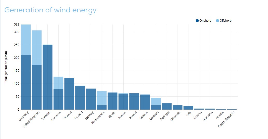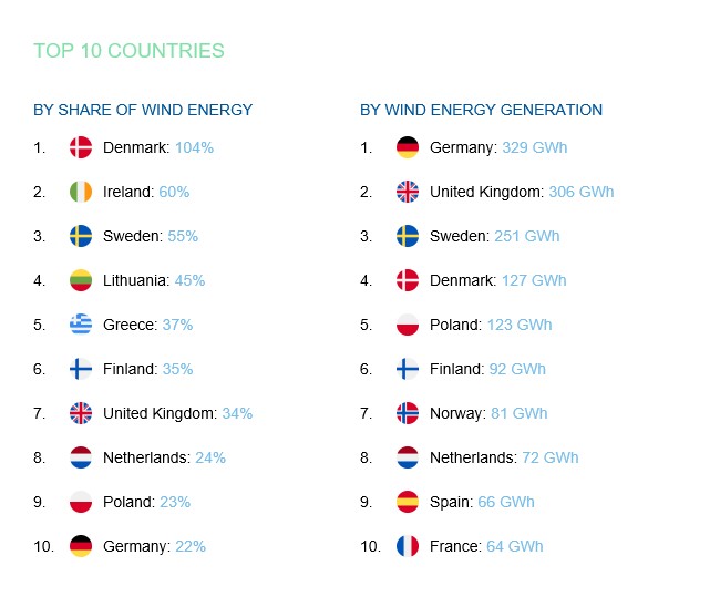 Στην παραγωγή αιολικής ενέργειας, η Ελλάδα, κατέλαβε τη 12η θέση με 58,2 GWh ενώ στις τρείς πρώτες θέσεις βρέθηκαν, η Γερμανία (328,7 GWh), το Ηνωμένο Βασίλειο με 306 GWh, και η Σουηδία με 251,1 GWh.