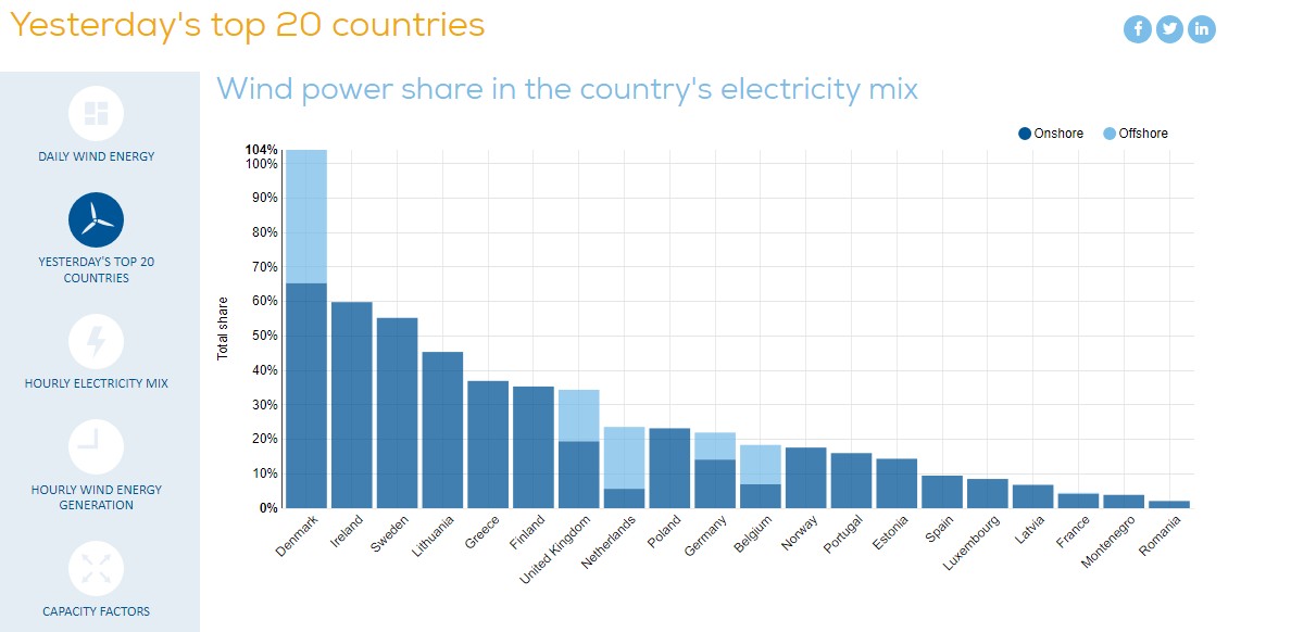 Η χώρα μας, με 37% συνεισφορά από τα αιολικά, βρέθηκε πίσω από Λιθουανία (45%), Σουηδία (55%), Ιρλανδία (60%) ενώ στην κορυφή της λίστας ήταν η Δανία (104%).