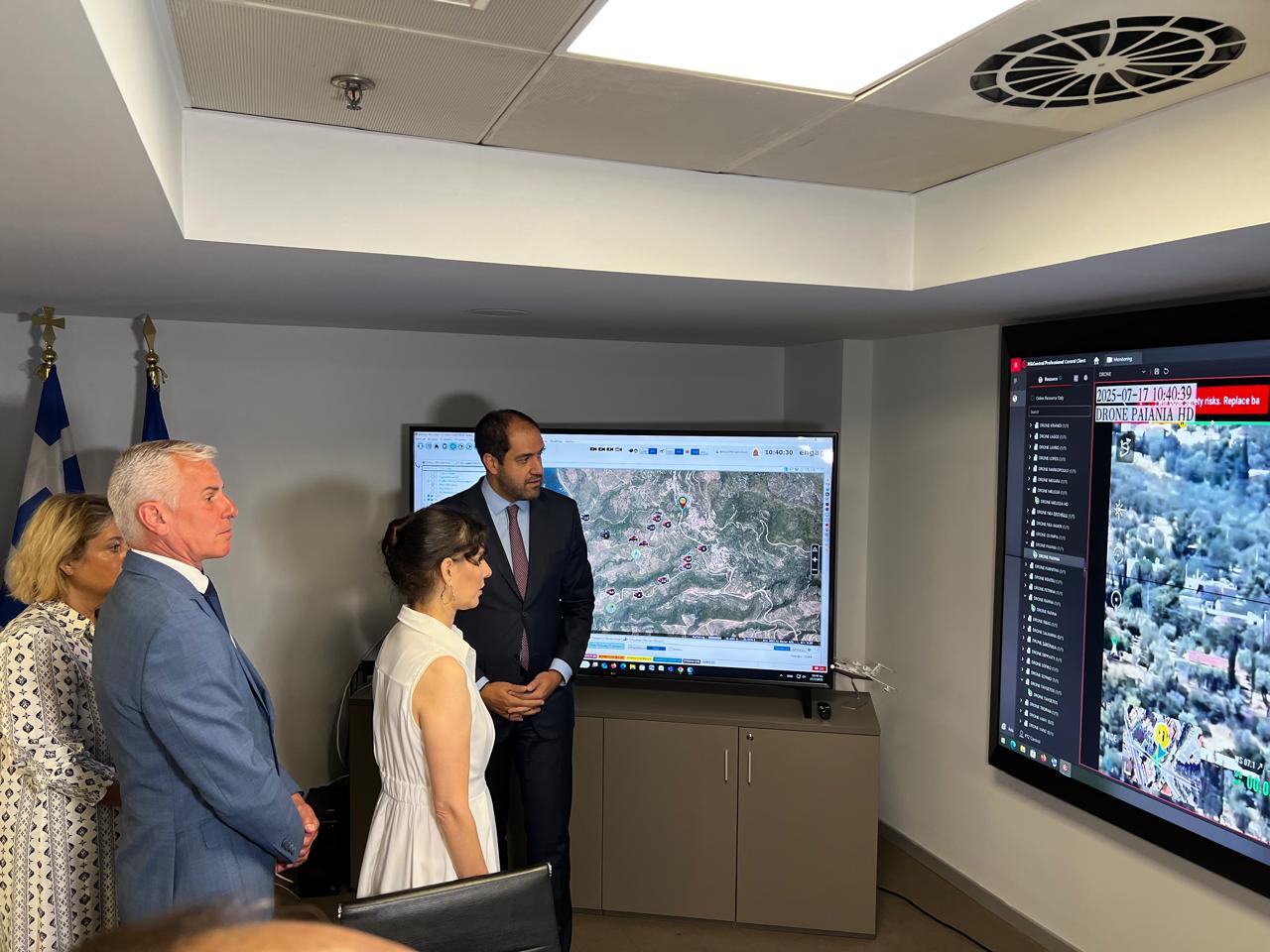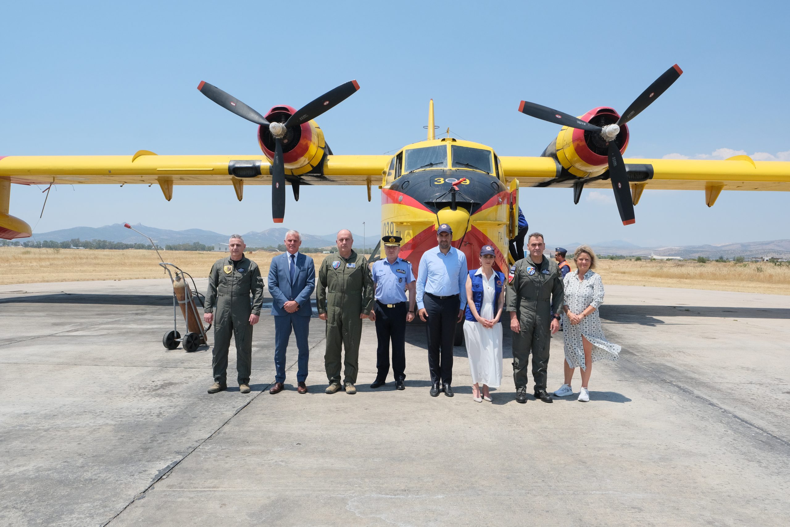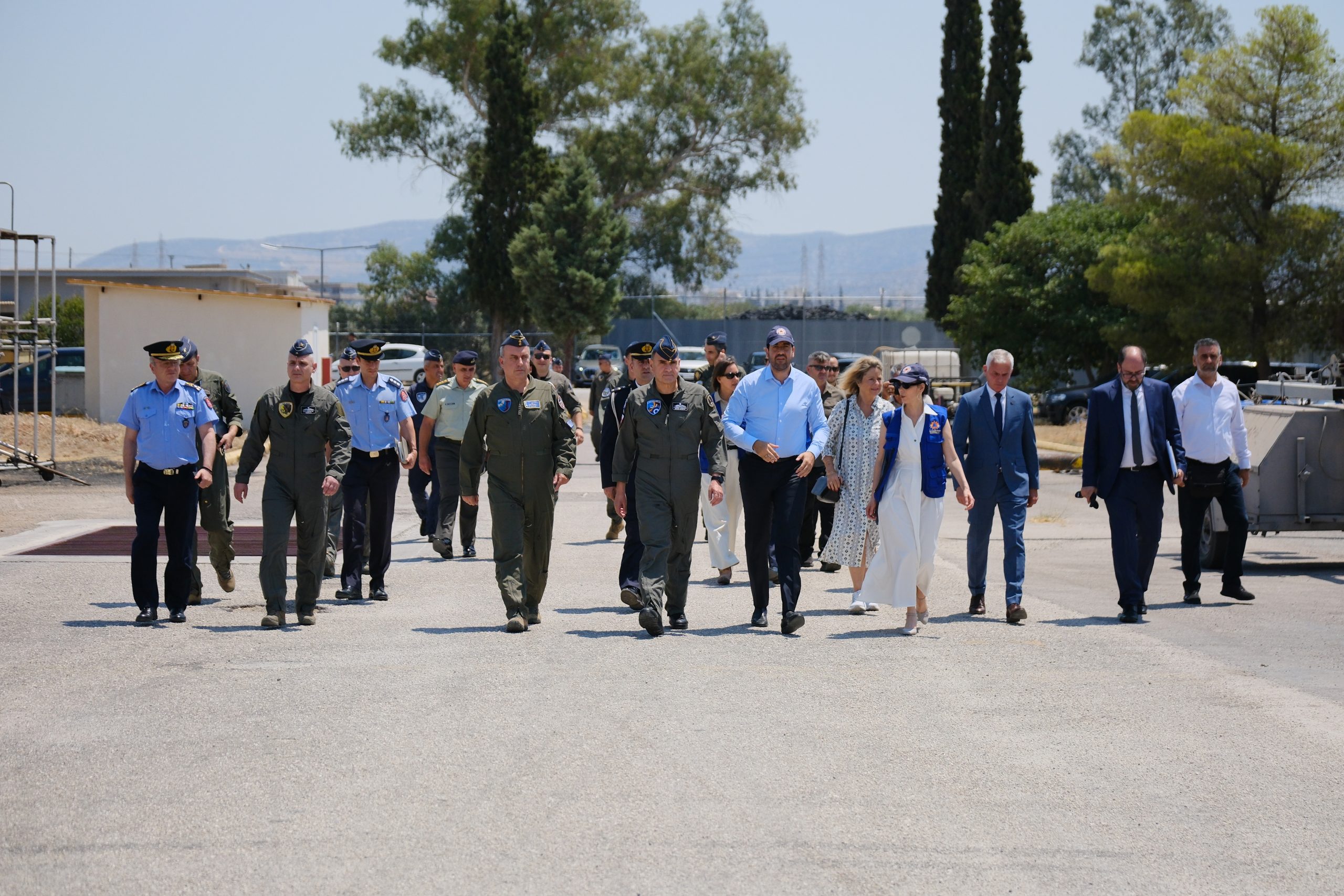 Το πρόγραμμα της επίσκεψης ολοκληρώθηκε με μετάβαση στην Αεροπορική Βάση Ελευσίνας, όπου η Επίτροπος επισκέφθηκε τα πυροσβεστικά αεροσκάφη Canadair, καθώς και τα επιχειρησιακά μέσα του ευρωπαϊκού μηχανισμού rescEU που σταθμεύουν στην Ελλάδα. Παράλληλα, πραγματοποιήθηκε επίδειξη εξοπλισμού και τακτικών από τα πληρώματα, αναδεικνύοντας τον κρίσιμο ρόλο των εναέριων μέσων και του προσωπικού στην αντιμετώπιση δασικών πυρκαγιών και άλλων φυσικών καταστροφών.