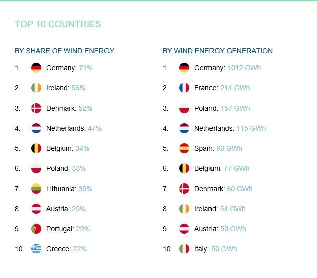 Στο μερίδιο της αιολικής ενέργειας, στο μείγμα ηλεκτρικής ενέργειας της χώρας, η Ελλάδα, κατέλαβε τη 15η θέση με 23,9 GWh ενώ στις τρείς πρώτες θέσεις βρέθηκε, η Γερμανία (1.012,3 GWh), η Γαλλία (213,9GWh), η Πολωνία (157,3 GWh).