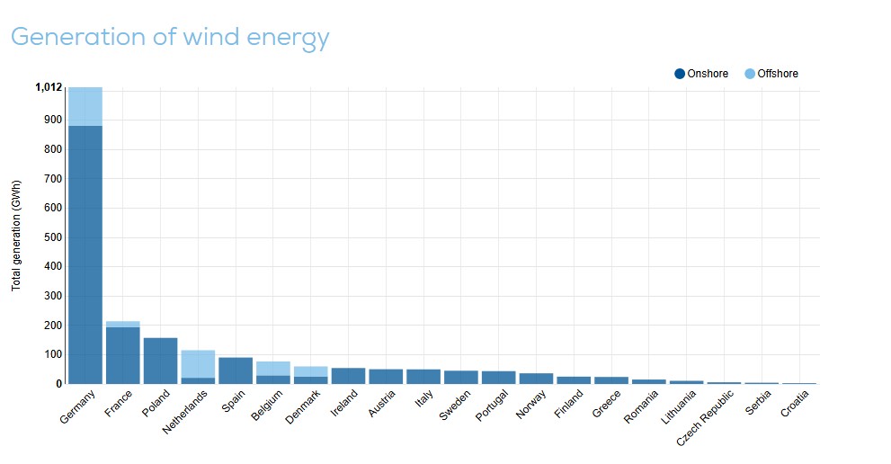 Συνολικά, στην Ευρώπη, τα αιολικά πρόσφεραν το 27,5% (2.104 GWh) εκ των οποίων το 4,3% (329 GWh) προήλθε από τα αιολικά πάρκα στη θάλασσα.