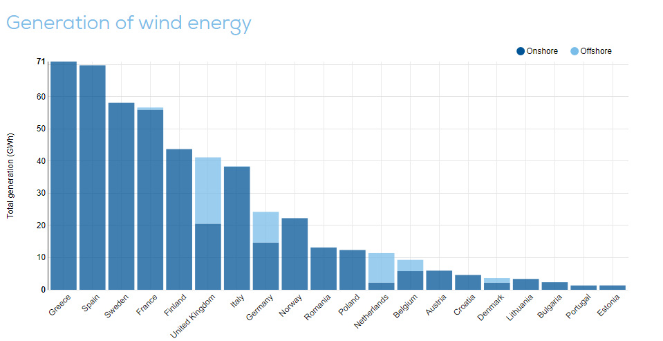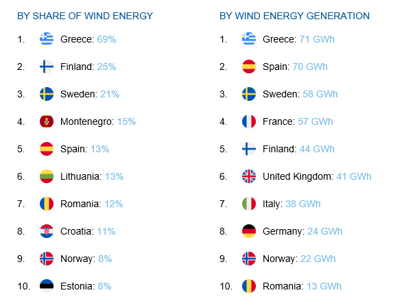Στην παραγωγή αιολικής ενέργειας, η Ελλάδα, κατέλαβε τη 1η θέση με 70,9 GWh ενώ κάτω από την χώρα μας, βρέθηκαν, η Ισπανία (2η με 69,8 GWh), και η Σουηδία (3η με 58,1 GWh).