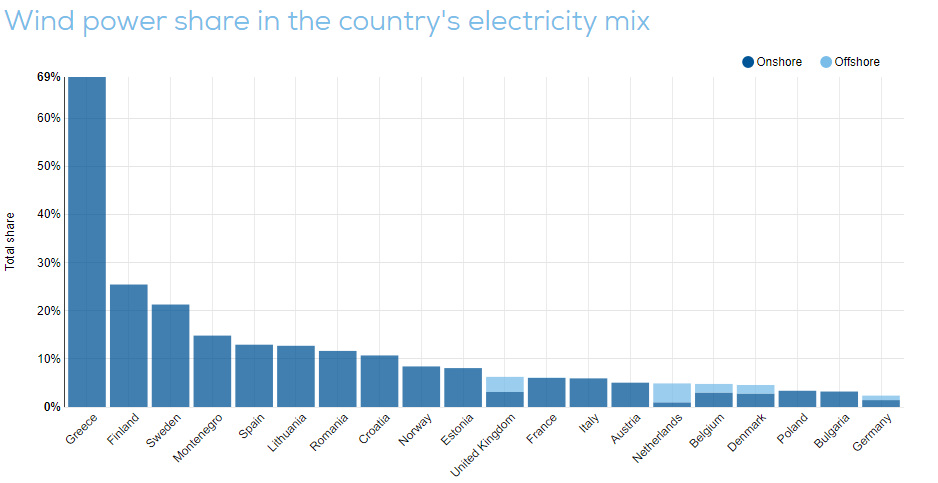 Η χώρα μας, με το 69% συνεισφορά από τα αιολικά, βρέθηκε στην κορυφή της σχετικής λίστας, μπροστά από τη Φινλανδία (25%) και τη Σουηδία (21%)