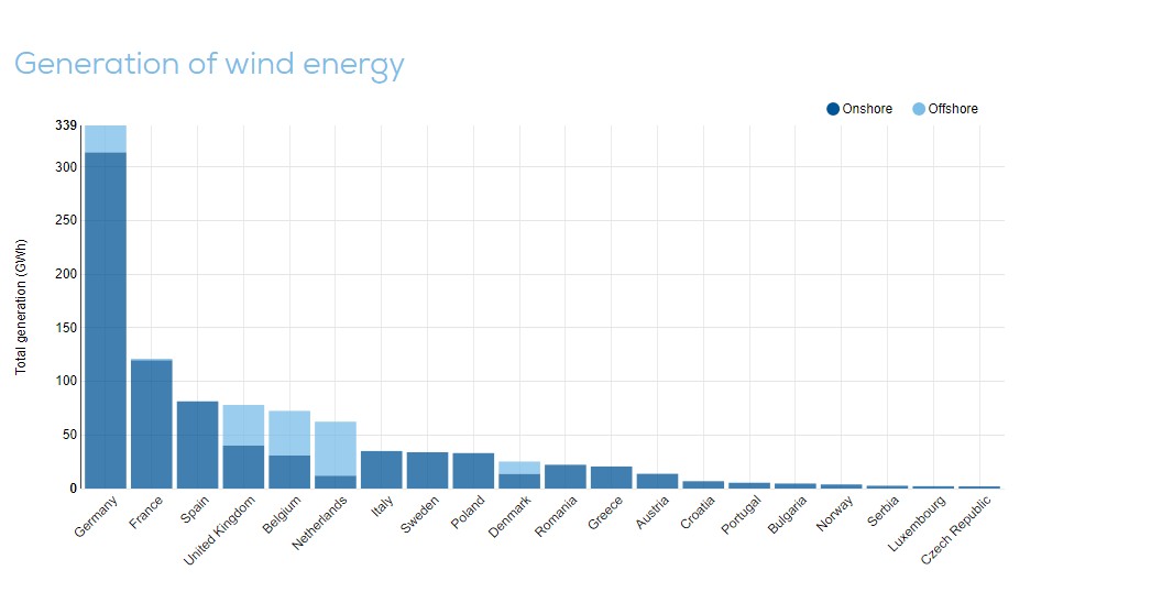 Συνολικά, στην Ευρώπη, τα αιολικά πρόσφεραν το 14,2% εκ των οποίων το 2,5% (168 GWh) προήλθε από τα αιολικά πάρκα στη θάλασσα.