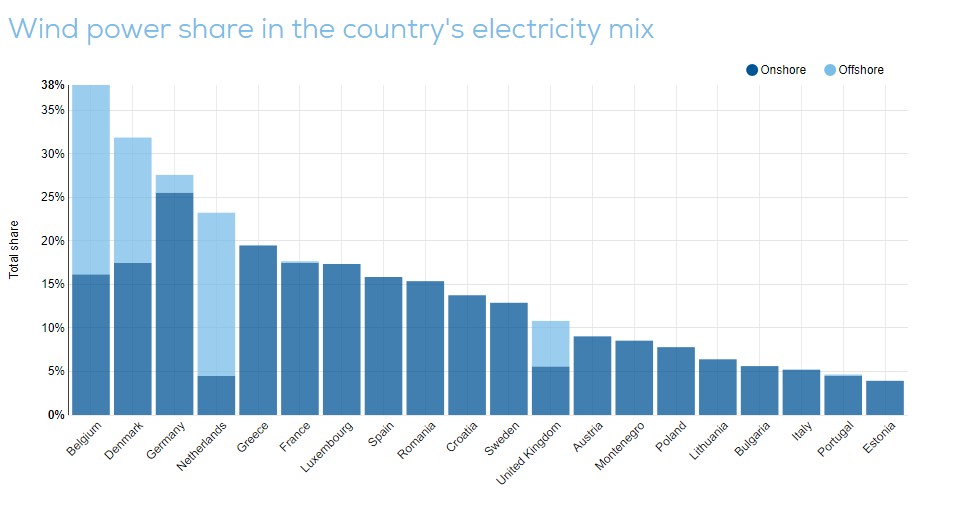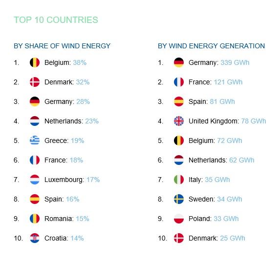 Η χώρα μας, με το 19% συνεισφορά από τα αιολικά, βρέθηκε πίσω από την Ολλανδία (23%) Γερμανία (28%), τη Δανία (32%), και το Βέλγιο (38%) που κατέλαβε την πρώτη θέση.