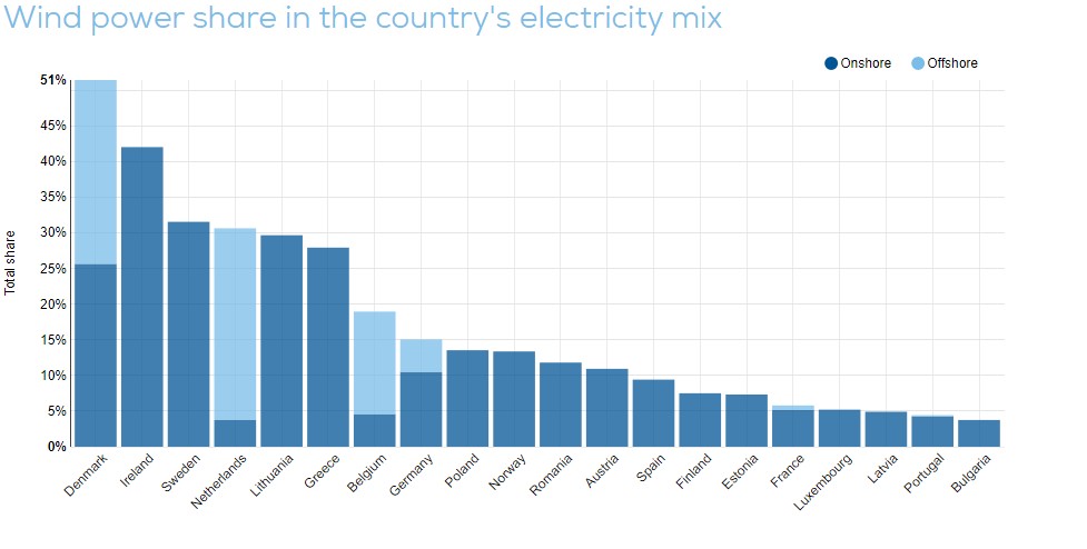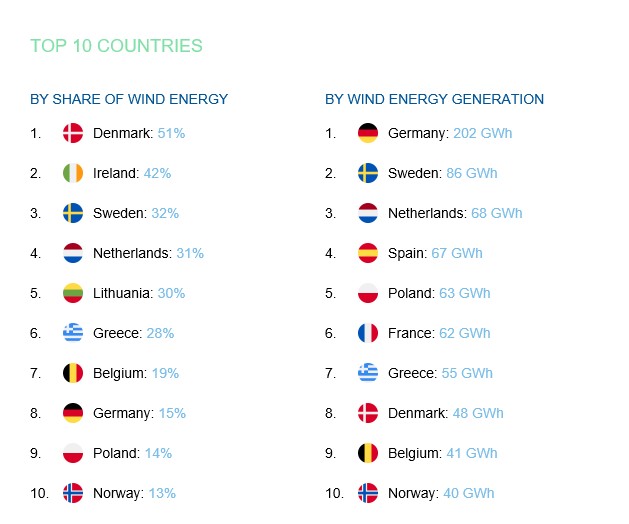Η χώρα μας, με 28% συνεισφορά από τα αιολικά, βρέθηκε στην μέση της σχετικής κατάταξης, με πρώτη τη Δανία (51%), την Ιρλανδία δεύτερη (42%) και τη Σουηδία τρίτη (32%).