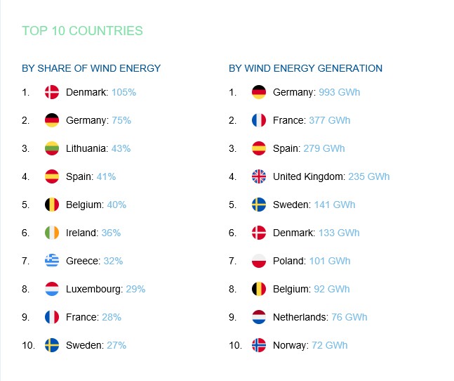 Η χώρα μας, με 32% συνεισφορά από τα αιολικά, βρέθηκε μπροστά από Λουξεμβούργο, Γαλλία και Σουηδία, ενώ στην κορυφή της λίστας ήταν η Δανία (105%), με την Γερμανία (75%) στη δεύτερη θέση και την Λιθουανία (43%) στην τρίτη θέση.