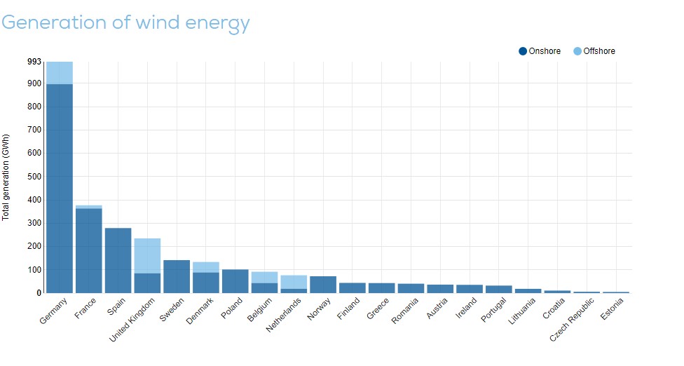 Συνολικά, στην Ευρώπη, τα αιολικά πρόσφεραν το 30,3% εκ των οποίων το 4,4% (409 GWh) προήλθε από τα αιολικά πάρκα στη θάλασσα.
