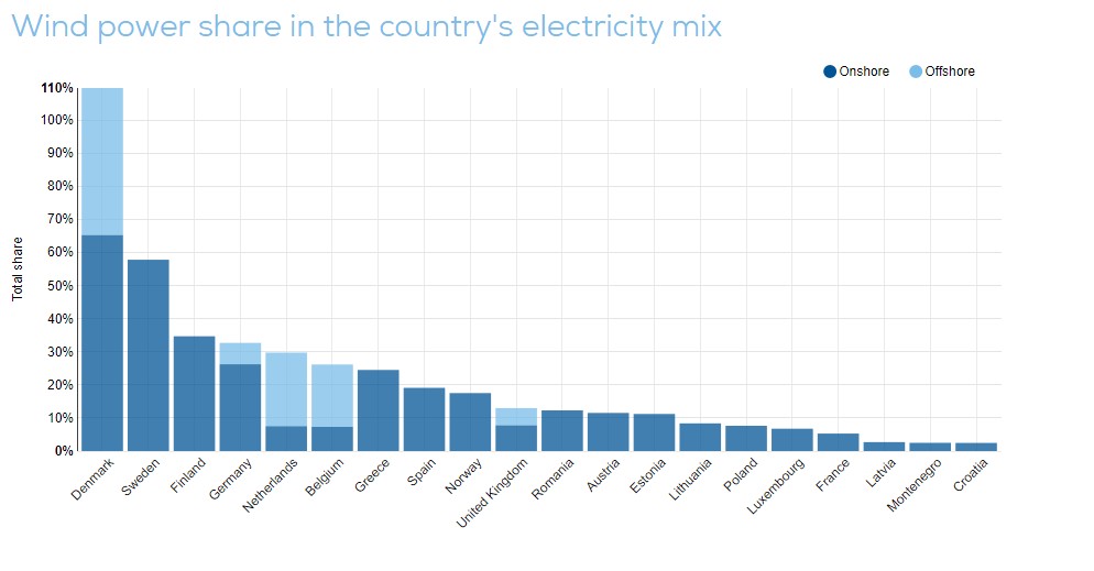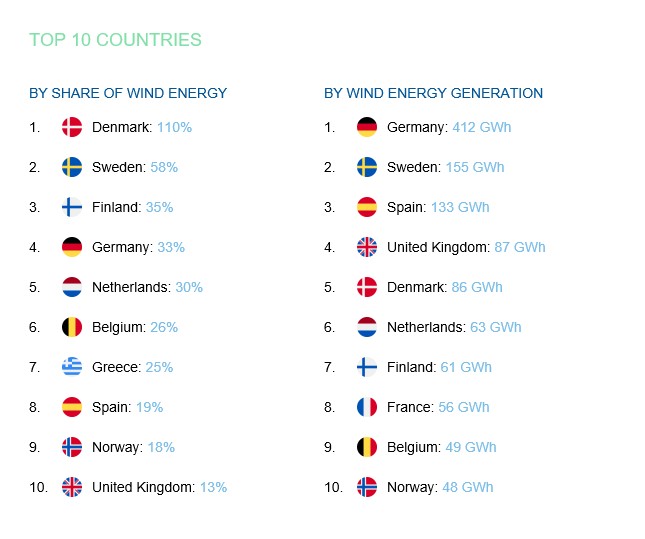Η χώρα μας, με 25% συνεισφορά από τα αιολικά, βρέθηκε πίσω από το Βέλγιο (26%) και την Ολλανδία (30%). Πρώτη ήταν η Δανία με 110% και δεύτερη η Σουηδία με 58%.