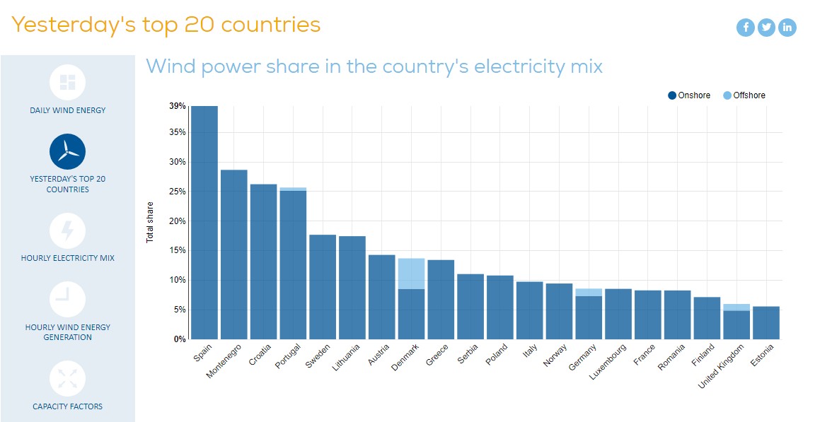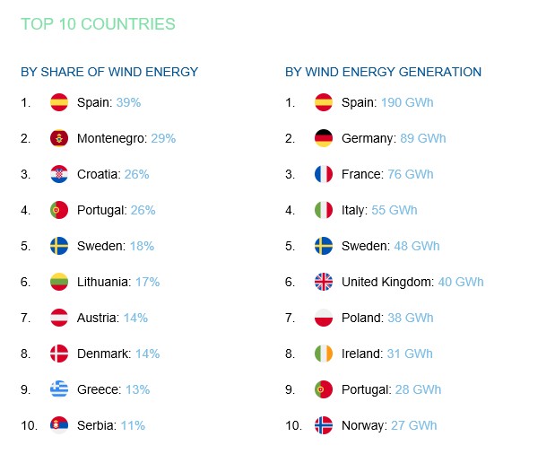 Η χώρα μας, με το 13% συνεισφορά από τα αιολικά, βρέθηκε πίσω από Δανία (14%) και Αυστρία (14%). Πρώτη ήταν η Ισπανία με 39% και το Μαυροβούνιο με 29%.