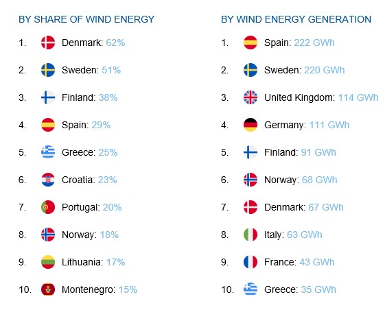 Στην 5η θέση ανέβηκε η Ελλάδα, μεταξύ των ευρωπαικών χωρών, στο μερίδιο της αιολικής ενέργειας στη ζήτηση ηλεκτρικής ενέργειας, σύμφωνα με το δελτίο της WindEurope, που εκπροσωπεί την ευρωπαική αιολική βιομηχανία. Η χώρα μας, στις 25 Ιανουαρίου, βρέθηκε πίσω από Ισπανία, Φινλανδία, Σουηδία και Δανία.