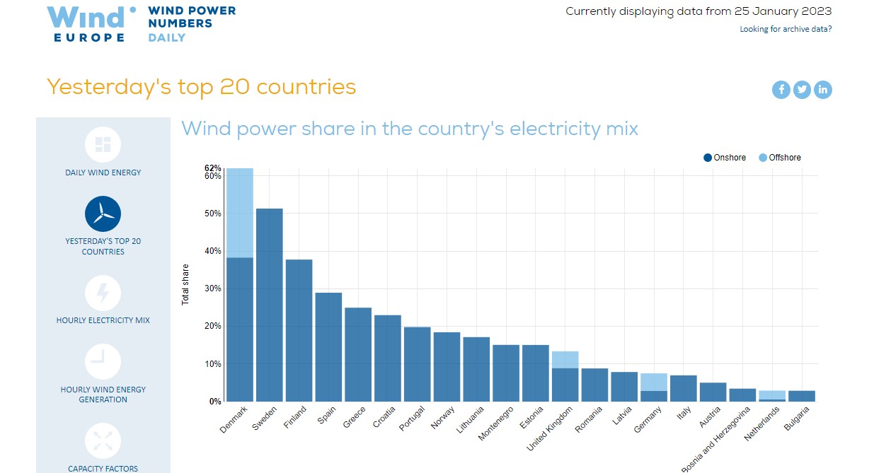 H WindEurope παρακολουθεί την εξέλιξη της αιολικής ενέργειας καθημερινά κι εκδίδει τα στοιχεία που αφορούν την συμμετοχή της ανανεώσιμης πηγής στην ζήτηση ηλεκτρικής ενέργειας.