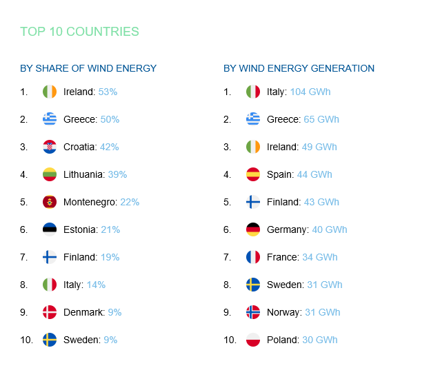 Στο μερίδιο της αιολικής ενέργειας, στο μείγμα ηλεκτρικής ενέργειας της χώρας, η Ελλάδα, κατέλαβε τη 5η θέση με 49 GWh, με πρώτη την Ισπανία (88 GWh) και δεύτερη την Ιταλία (87 GWh).