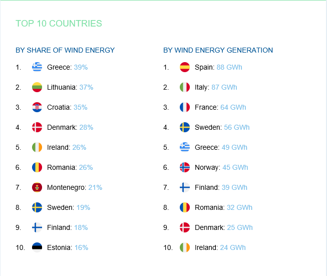 Στο μερίδιο της αιολικής ενέργειας, στο μείγμα ηλεκτρικής ενέργειας της χώρας, η Ελλάδα, κατέλαβε τη 2η θέση με 65 GWh, με πρώτη την Ιταλία (104 GWh).