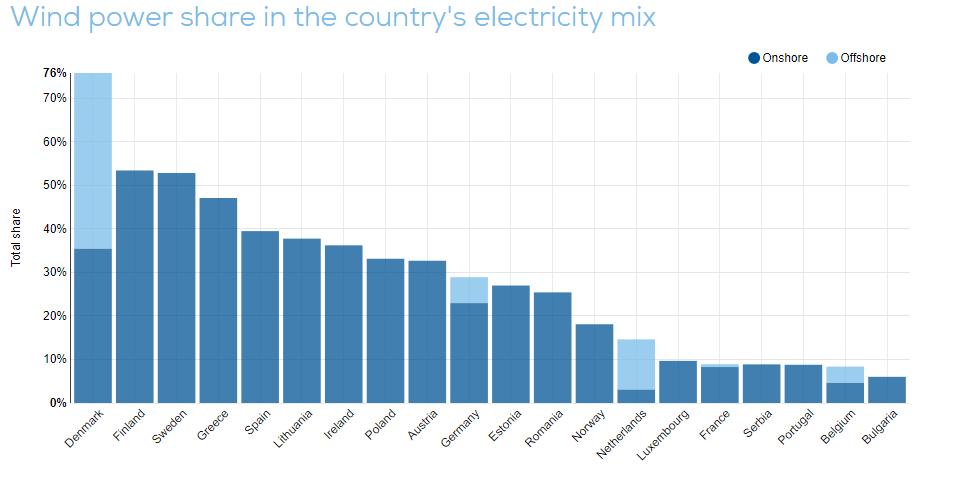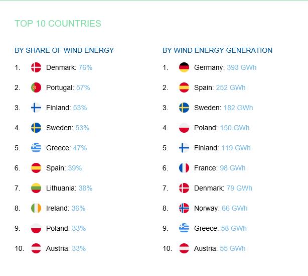 Η χώρα μας, με 47% συνεισφορά από τα αιολικά, βρέθηκε πίσω από την Σουηδία 53%, με πρώτη τη Δανία (76%), δεύτερη την Πορτογαλία (57%). Την τρίτη θέση κατέλαβε η Φινλανδία (53%).