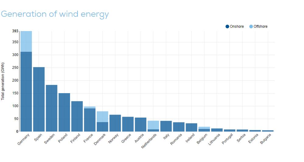 Στην παραγωγή αιολικής ενέργειας, η Ελλάδα, κατέλαβε τη 9η θέση με 58 GWh ενώ στις δυο πρώτες θέσεις βρέθηκαν, η Γερμανία (393 GWh) και η Ισπανία (252 GWh).