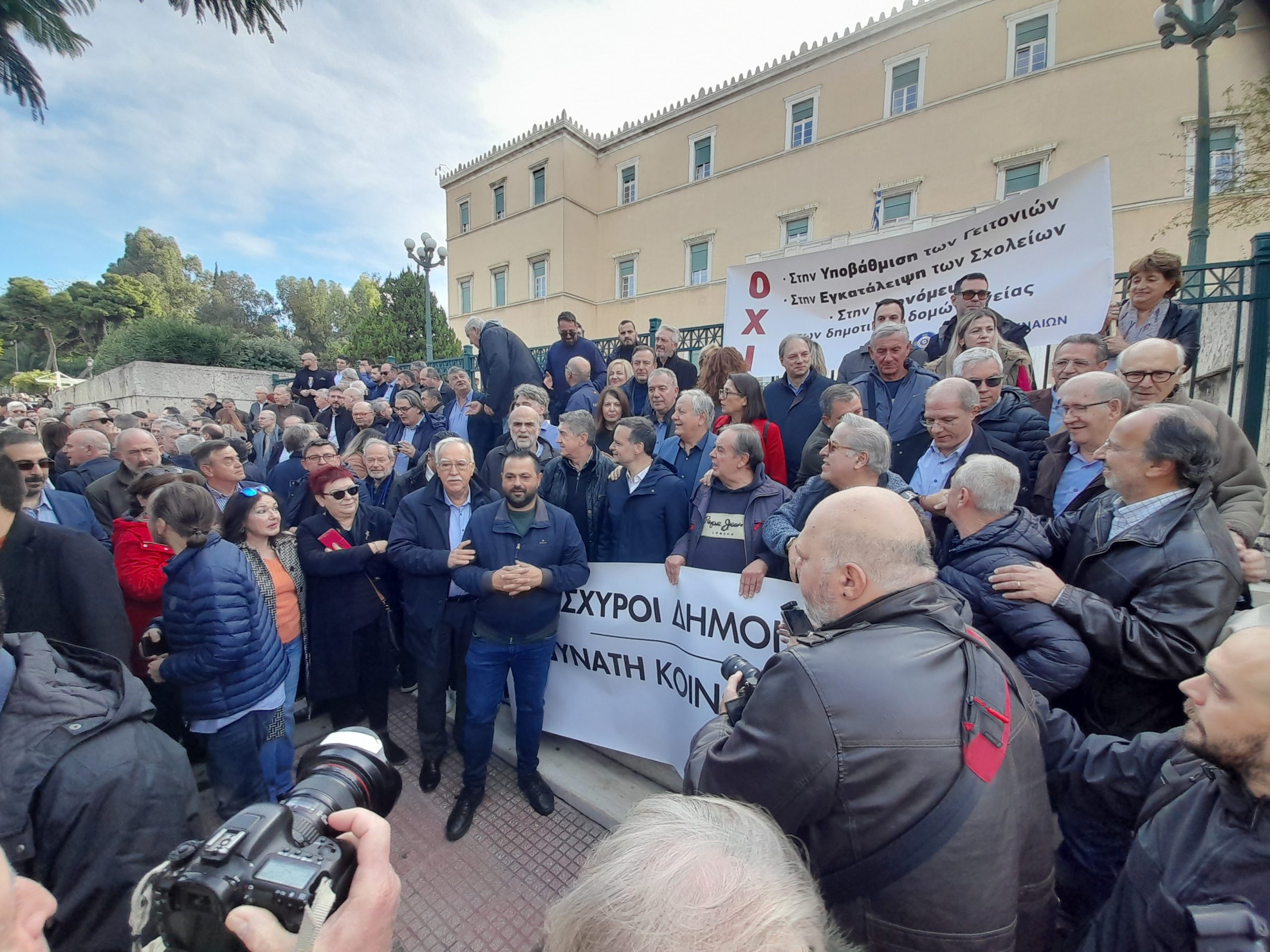Μαζική συμμετοχή είχε η κινητοποίηση αιρετών της Πρωτοβάθμιας Τοπικής Αυτοδιοίκησης έξω από τη Βουλή των Ελλήνων, με τη συμμετοχή Δημάρχων, Δημοτικών Συμβούλων, εργαζομένων και εκπροσώπων Δήμων από κάθε γωνιά της χώρας.