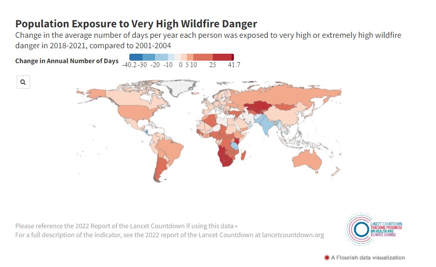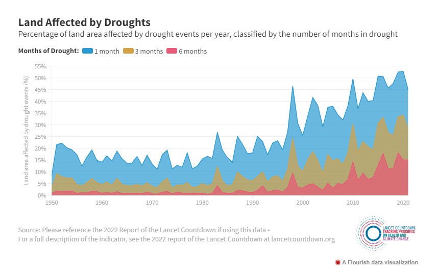 Κατά μέσο όρο, 29% περισσότερη παγκόσμια έκταση επηρεάστηκε από ακραία ξηρασία για τουλάχιστον ένα μήνα ετησίως το 2012-21 σε σχέση με το 1951-1960 και η ανθρώπινη έκθεση σε ημέρες με πολύ υψηλό ή εξαιρετικά υψηλό κίνδυνο πυρκαγιάς αυξήθηκε στο 61% των χωρών από το 2001-2004 έως το 2018-2021.