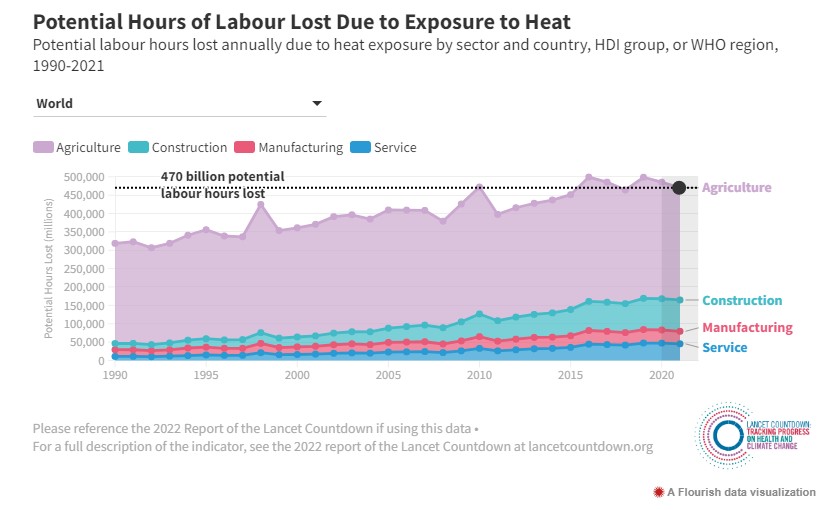 Η έκθεση του πληθυσμού στον καύσωνα οδήγησε σε απώλεια 470 δισεκατομμυρίων δυνητικών ωρών εργασίας παγκοσμίως το 2021, με πιθανές απώλειες εισοδήματος 669 δισεκατομμυρίων δολαρίων ΗΠΑ συνολικά.