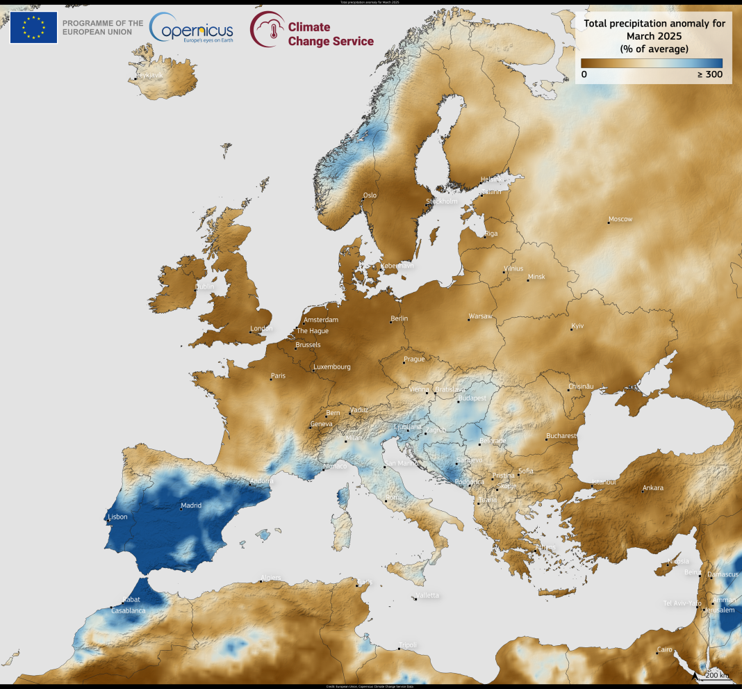 Αυτή η οπτικοποίηση δεδομένων, με βάση τα δεδομένα C3S, δείχνει τη συνολική ανωμαλία βροχοπτώσεων στην Ευρώπη για τον μήνα. Υπογραμμίζει ότι το μεγαλύτερο μέρος της νοτιοδυτικής Ευρώπης επηρεάστηκε από επίπεδα βροχόπτωσης άνω του μέσου όρου, ιδιαίτερα στην Ιβηρική Χερσόνησο.