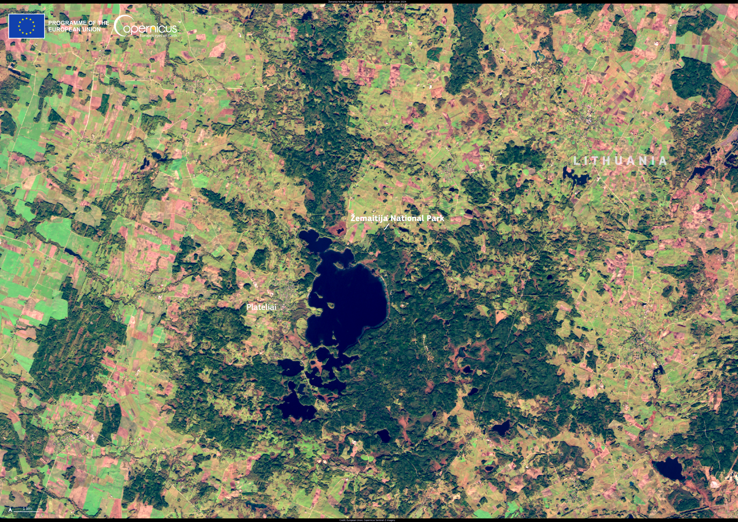Αυτή η εικόνα του Copernicus Sentinel-2, που ελήφθη στις 18 Οκτωβρίου 2024, δείχνει το Εθνικό Πάρκο Žemaitija στη Λιθουανία.