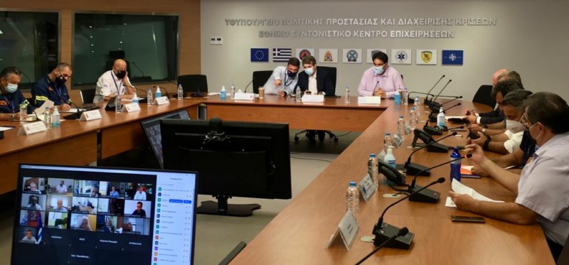Συνολική αντιμετώπιση για τις επιπτώσεις των υψηλών θερμοκρασιών στην χώρα μας ανέδειξε η σύσκεψη στο Κέντρο Επιχειρήσεων της Πολιτικής Προστασίας υπό τον Υπουργό Προστασίας του Πολίτη, Μιχάλη Χρυσοχοΐδη, τον Υφυπουργό Πολιτικής Προστασίας και Διαχείρισης Κρίσεων, Νίκο Χαρδαλιά. Παρών ήταν και ο Υφυπουργός στον Πρωθυπουργό, Θοδωρής Λιβάνιος.