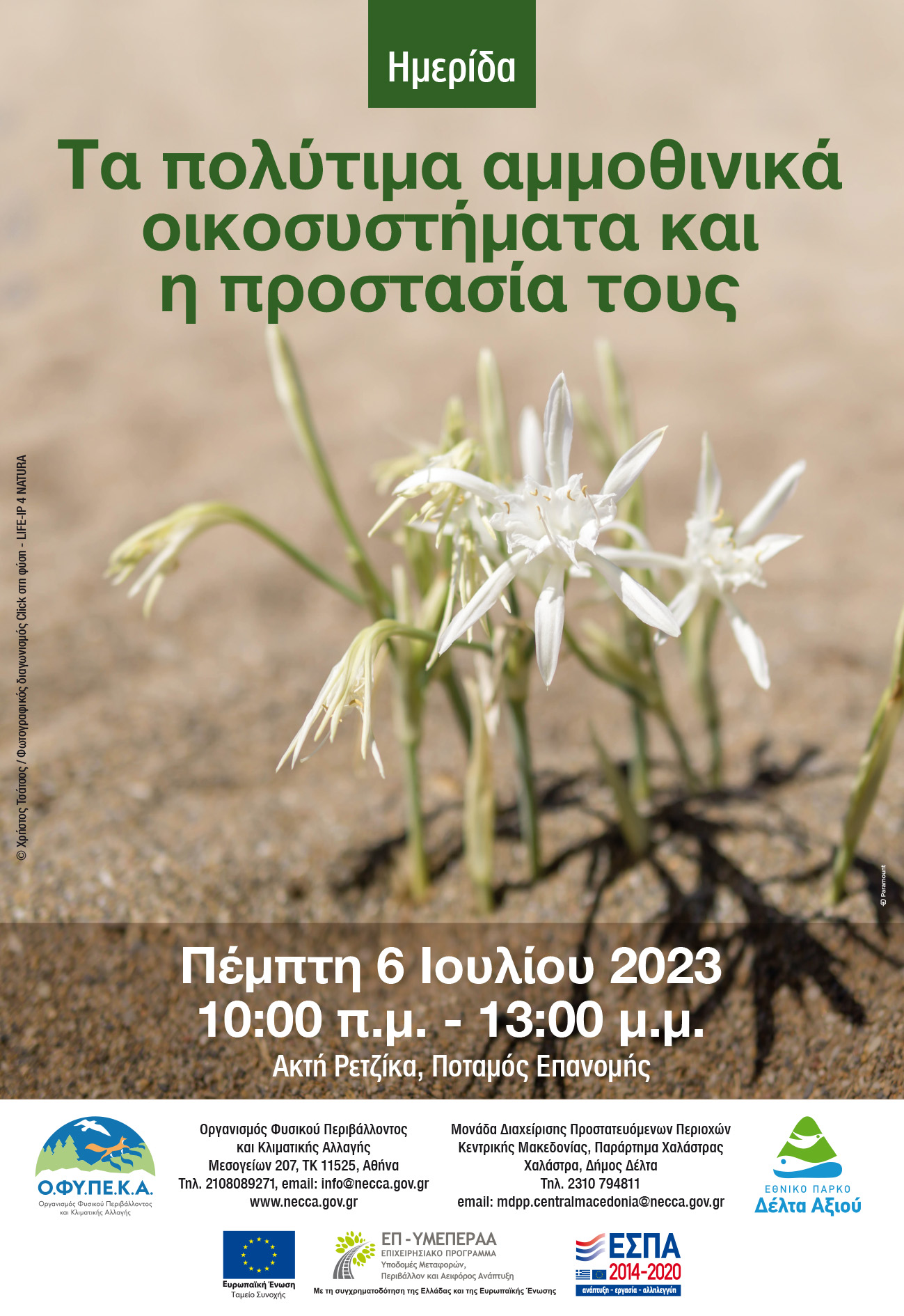 Την Πέμπτη 6 Ιουλίου η Μονάδα Διαχείρισης Προστατευόμενων Περιοχών Κεντρικής Μακεδονίας του Οργανισμού Φυσικού Περιβάλλοντος και Κλιματικής Αλλαγής (ΟΦΥΠΕΚΑ) διοργανώνει στην Επανομή, ημερίδα με τίτλο «Τα πολύτιμα αμμοθινικά οικοσυστήματα και η προστασία τους».