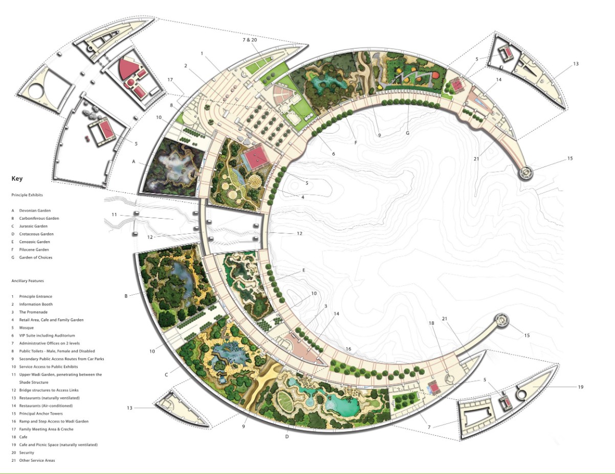 Το έργο αποτελείται από δύο γιγάντια θερμοκήπια σε σχήμα δύο αλληλένδετων ημισελήνων, με συνολική επιφάνεια 9 εκταρίων, καθένα από τα οποία θα στεγάσει ένα βιοσύστημα, με άλλα λόγια, μια οικολογική κοινότητα χαρακτηριστικής βλάστησης και πανίδας, που καθορίζεται από το κλίμα και τη γεωγραφία.