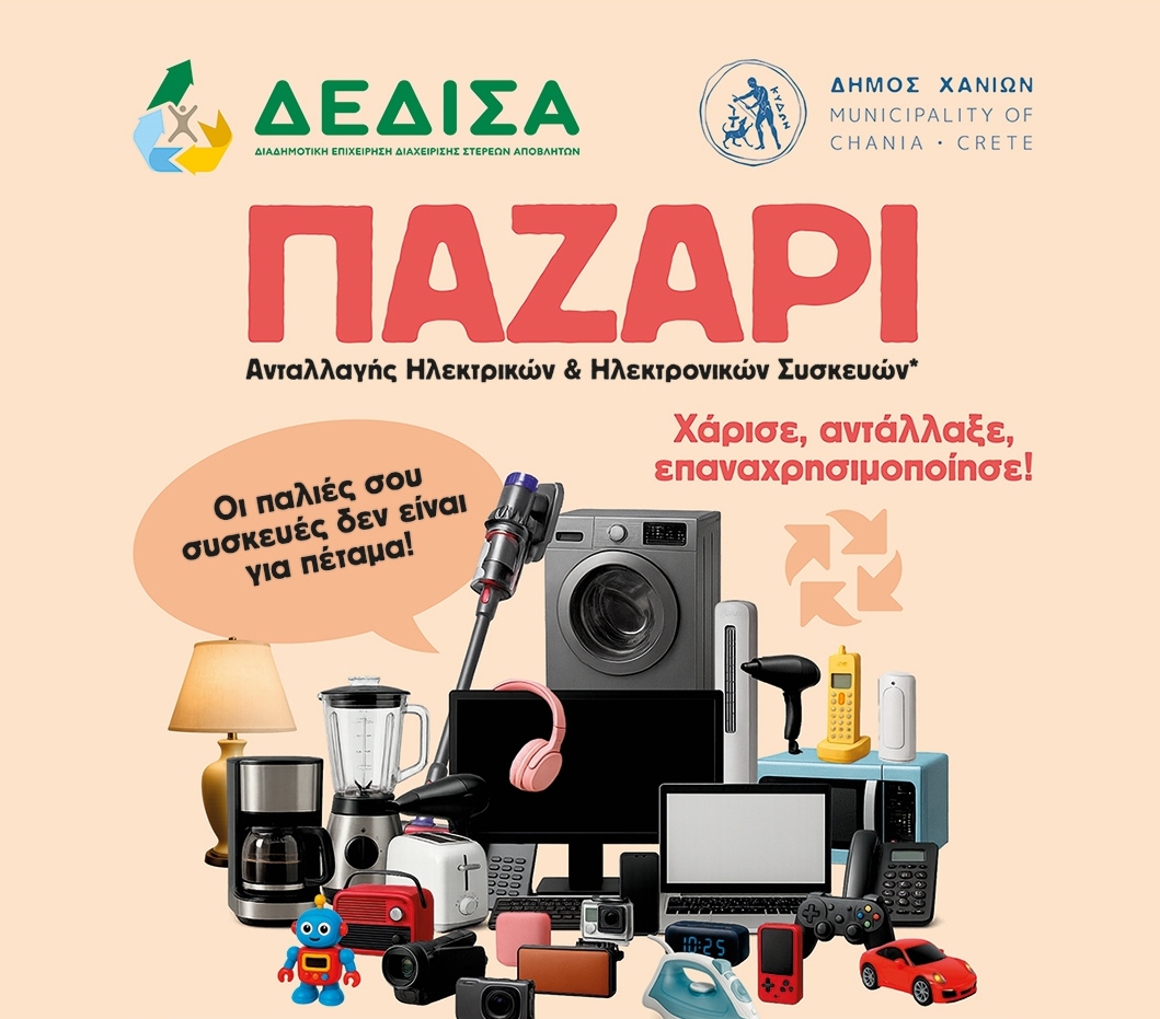 Η Διαδημοτική Επιχείρηση Διαχείρισης Στερεών Αποβλήτων [ΔΕΔΙΣΑ Α.Ε. (ΟΤΑ)] και ο Δήμος Χανίων, στο πλαίσιο της Ευρωπαϊκής Εβδομάδας Μείωσης Αποβλήτων (EWWR), διοργανώνουν Παζάρι «Ανταλλαγής» Ηλεκτρικών και Ηλεκτρονικών Συσκευών, με στόχο την προώθηση της επαναχρησιμοποίησης, τη μείωση των αποβλήτων και την ευαισθητοποίηση της κοινωνίας γύρω από την κυκλική οικονομία.
