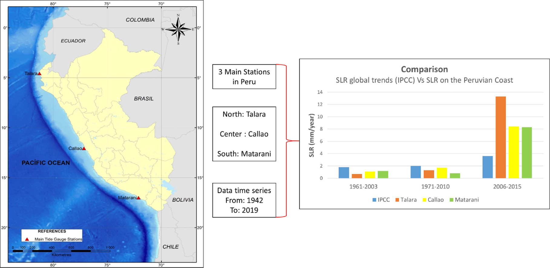 Εχουν αναλυθεί δεδομένα 78 ετών από τη στάθμη της θάλασσας στις ακτές του Περού, για να ποσοτικοποιηθεί η μεταβλητότητά της και να ελεγχθεί η τάση της. Τα δεδομένα προέρχονται από το 1942, από σταθμούς παλίρροιας Talara, Callao και Matarani που βρίσκονται κατά μήκος της ακτής του Περού. «Από την ανάλυση, παρατηρήσαμε μια σταθερή αύξηση της στάθμης της θάλασσας» αναφέρεται στην έρευνα, με διαχρονικές αλλαγές λόγω του φαινομένου ENSO (El Niño Southern Oscillation), δηλαδή την επίδραση του El Niño.