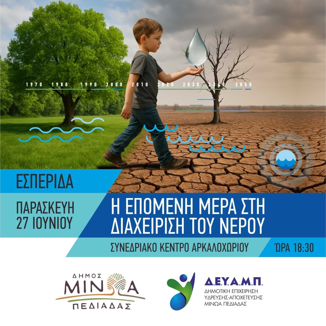 Στο πλαίσιο της Παγκρήτιας Αγροκτηνοτροφικής Έκθεσης ο Δήμος Μινώα Πεδιάδας και η ΔΕΥΑΜΠ, διοργανώνουν την Παρασκευή 27 Ιουνίου, στις 18:30, εσπερίδα με θέμα: “Η επόμενη μέρα στη διαχείριση του νερού”, στο Συνεδριακό Κέντρο Αρκαλοχωρίου.