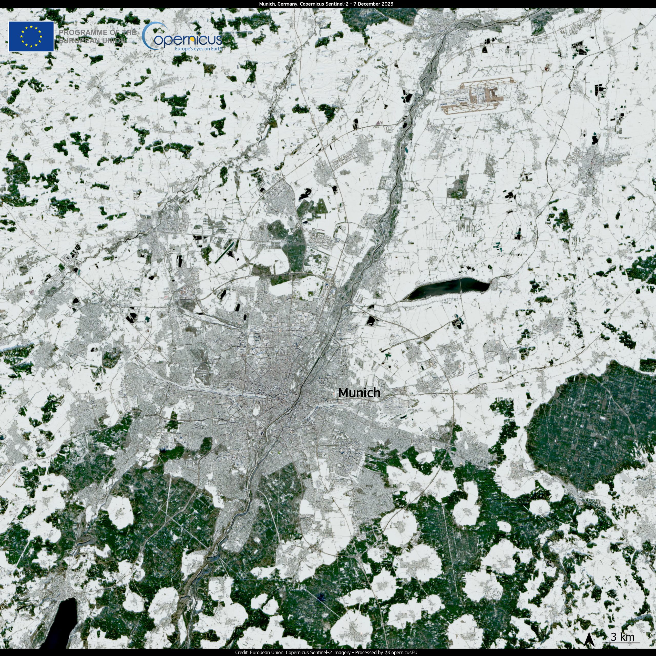Αυτή η εικόνα του Μονάχου αποκτήθηκε από έναν από τους δορυφόρους Copernicus Sentinel-2 στις 7 Δεκεμβρίου δείχνει τις τεράστιες ποσότητες χιονιού που εξακολουθούσαν να υπάρχουν γύρω από την πόλη.