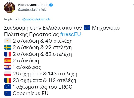 Στοιχεία για τις χώρες που βοήθησαν την Ελλάδα έδωσε μέσω twitter και ο Έλληνας ευρωβουλευτής, Νίκος Ανδρουλάκης, εισηγητής του Κοινοβουλίου για το rescEU.