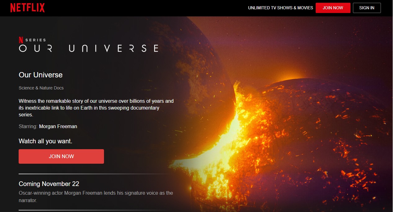 Δεν θα μπορούσε να λείψει από την μικρή οθόνη και την πλατφόρμα με τις υπηρεσίες ψυχαγωγίας του Netflix, σειρά που θα έχει ως αντικείμενο την προστασία του περιβάλλοντος και την ιστορία του Πλανήτη. Το πρώτο μέρος, η σειρά των έξι επεισοδίων θα κάνει πρεμιέρα στις 22 Νοεμβρίου με παραγωγή από τα στούντιο του BBC και με την φωνή του βραβευμένου με Όσκαρ, Αμερικανού ηθοποιού, Μόργκαν Φρίμαν. Το πρώτο μέρος ονομάζεται «Our Universe»