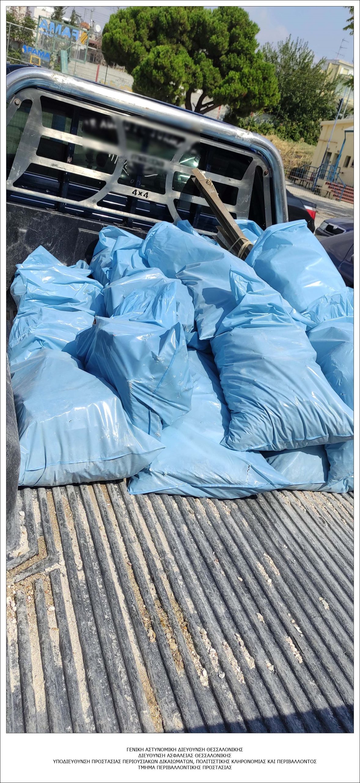 «Αστυνομικοί του Τμήματος Περιβαλλοντικής Προστασίας της Διεύθυνσης Ασφάλειας Θεσσαλονίκης, συνέλαβαν μεσημβρινές ώρες χθες (18-09-2023), δύο αλλοδαπούς, ηλικίας 34 και 26 ετών, σε βάρος των οποίων σχηματίσθηκε δικογραφία για παράβαση που αφορά στη Νομοθεσία «Για την Προστασία του Περιβάλλοντος».