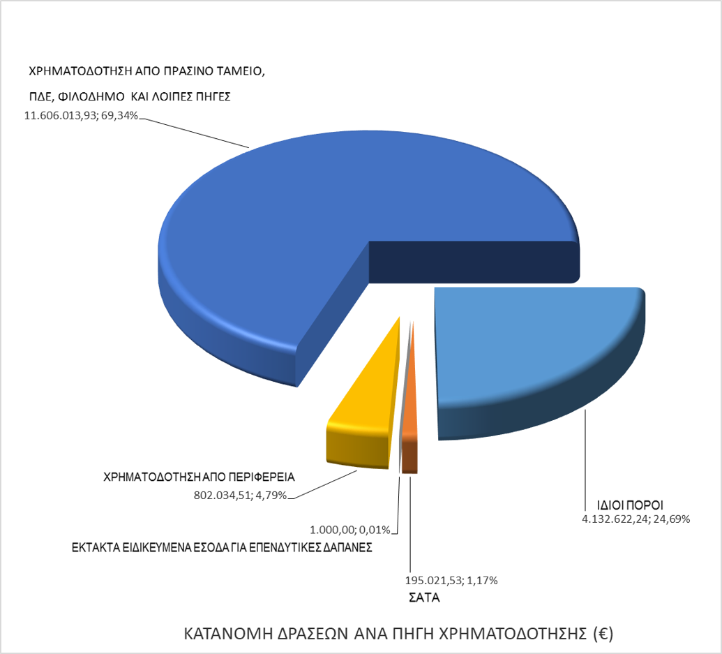 Το 76% των χρημάτων, ποσό 11.660.000 ευρώ, προήλθε από εξωτερικές πηγές χρηματοδότησης («Φιλόδημος», ΠΔΕ, Πράσινο Ταμείο) και μόλις το 24,69%, ποσό 4.132.000 ευρώ, από ίδιους πόρους του Δήμου.