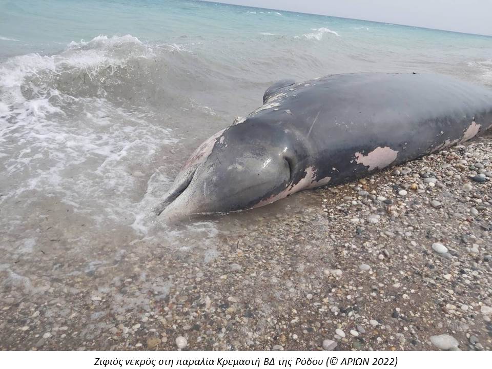 Ο ζιφιός προσάραξε νεκρός την περασμένη Δευτέρα στην παραλία Κρεμαστή, ΒΔ της πόλης της Ρόδου. Σύμφωνα με τα πρώτα ευρήματα της νεκροψίας-νεκροτομής. Ο θάνατος του ζώου σχετίζεται με κατάποση μεγάλης ποσότητας πλαστικών που υπερβαίνει σε βάρος τα 15 κιλά.