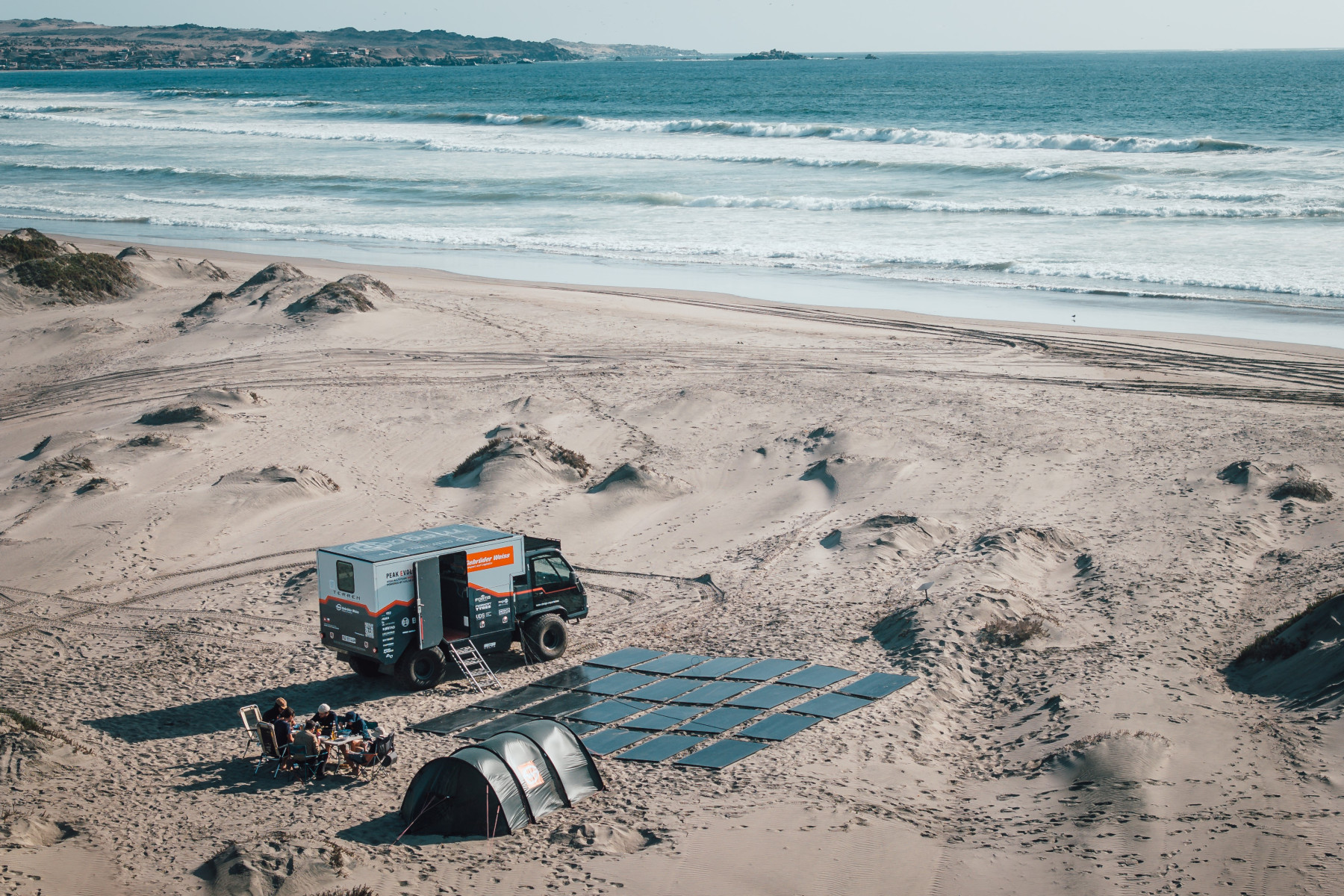 Το εντυπωσιακό εγχείρημα ξεκίνησε πριν από δύο μήνες: η Gebrüder Weiss μετέφερε το ηλεκτρονικό φορτηγό από την Ελβετία μέσω Ρότερνταμ και στη συνέχεια με θαλάσσιο φορτίο στη Χιλή. Μια άλλη χερσαία μεταφορά μετέφερε το ηλιακό φορτηγό στην περιοχή Atacama.