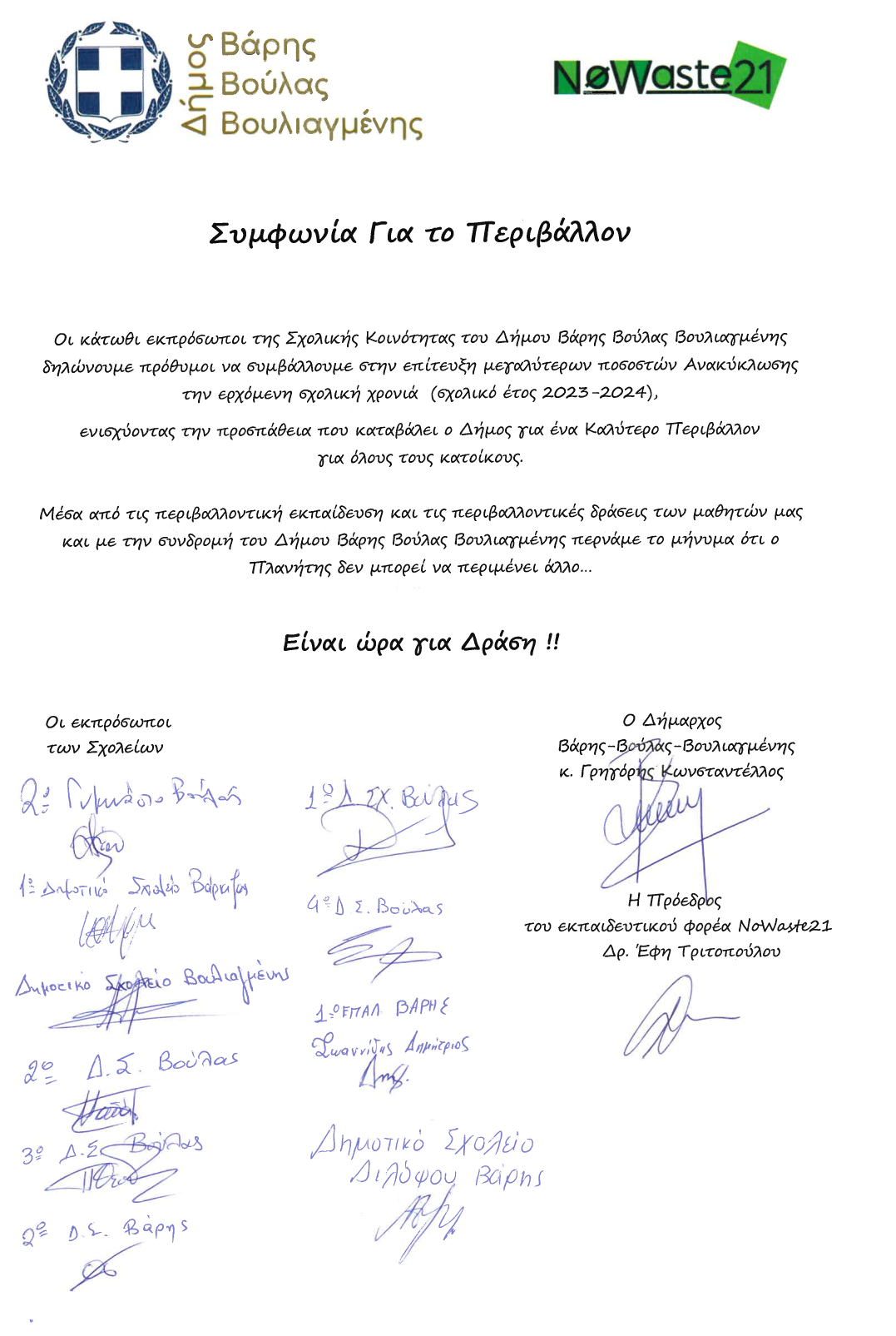 Ο Δήμαρχος κ. Γ. Κωνσταντέλλος όπως και οι εκπρόσωποι της σχολικής κοινότητας που ήταν παρόντες, υπέγραψαν Συμφωνία για το Περιβάλλον για την αύξηση της Ανακύκλωσης την ερχόμενη σχολική χρονιά, ενισχύοντας την προσπάθεια που καταβάλει ο Δήμος για ένα καλύτερο περιβάλλον για όλους τους κατοίκους.